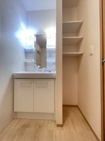 化粧品や洗面道具といった小物をまとめて収納できる洗面化粧台が付いております。知らない人が来た時でも玄関を開ける必要がなくなるモニター付きインターホンが付いております。